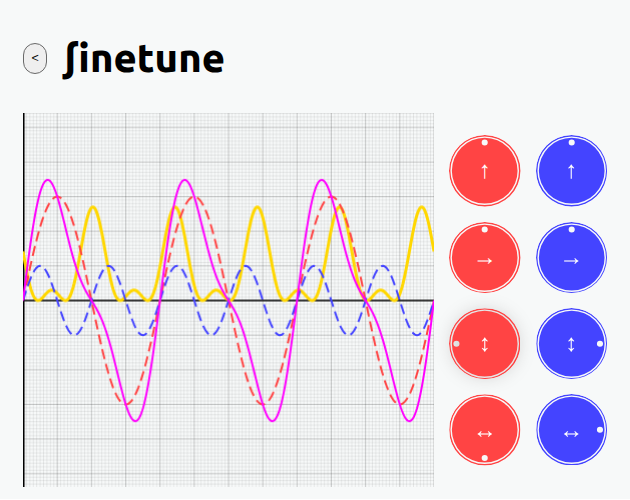 - When there are two sets of dials, the red dials control the red wave, the blue dials control the blue wave, and both are superposed (summed) to form the pink wave which should be matched to the goal wave.